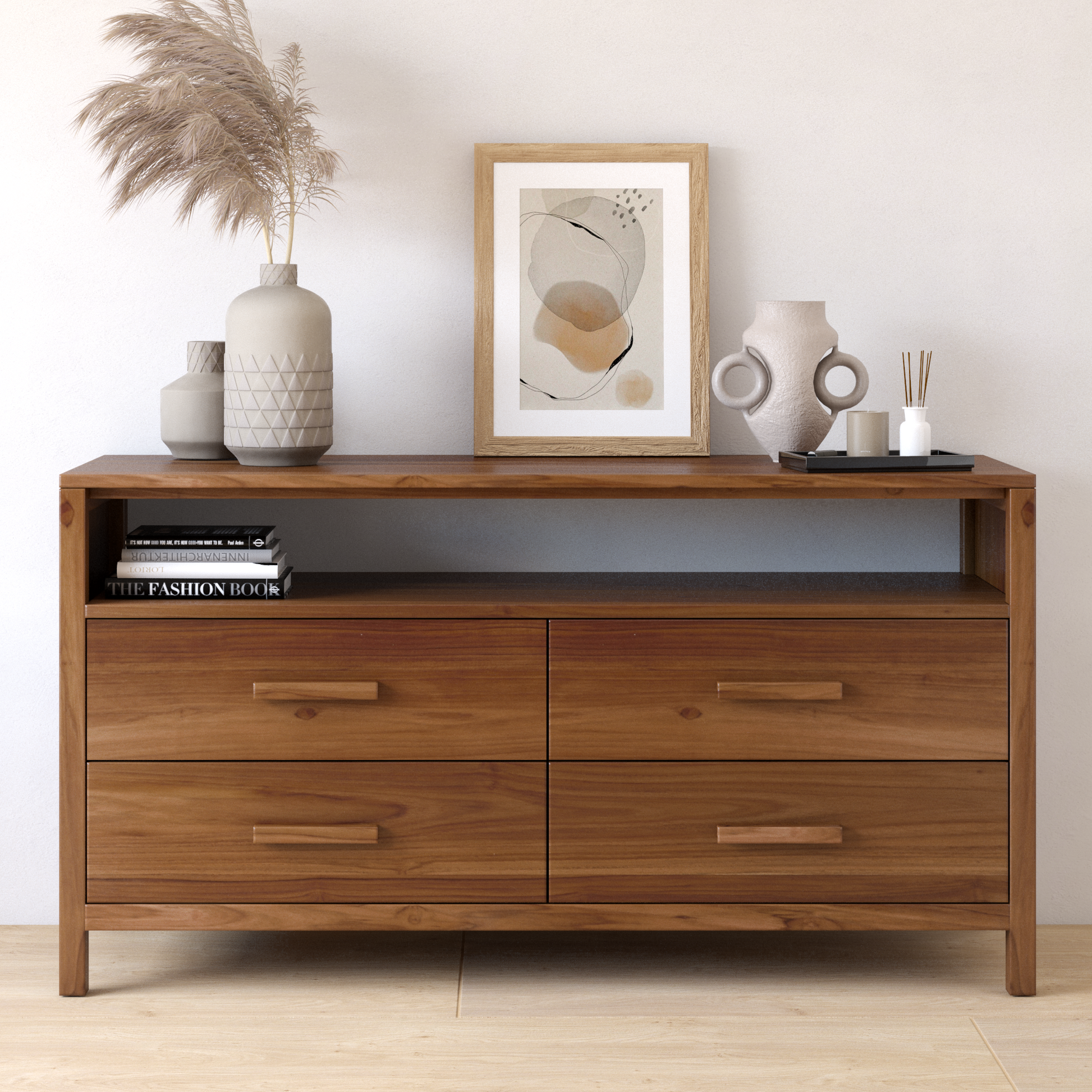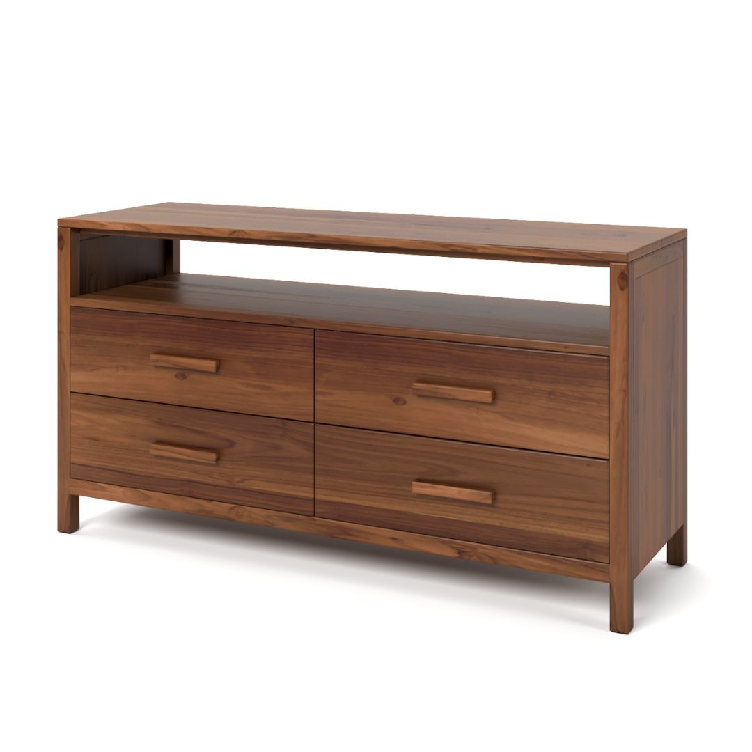 Con 4 gavetas con haladeras de madera y un entrepaño abierto